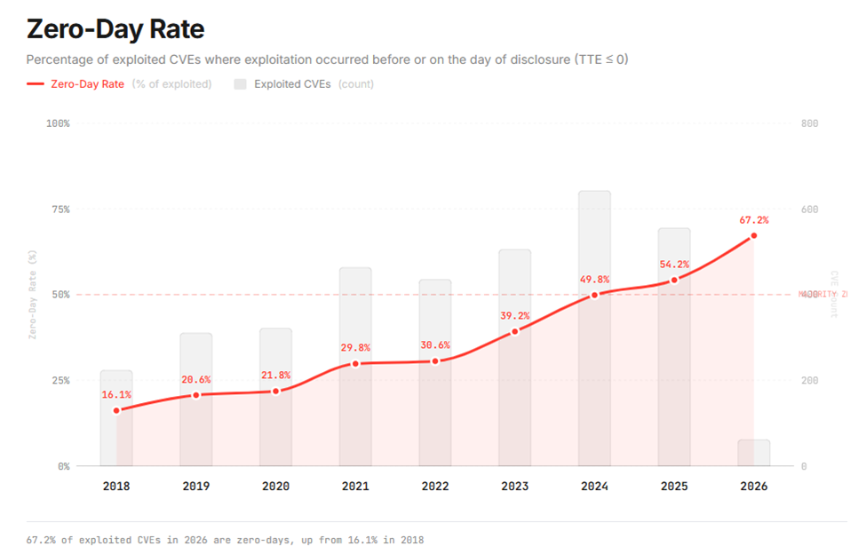 Second, if you did not already know this: the vast majority of publicly reported exploited vulnerabilities are zero-days, where the vulnerability is being actively exploited by a real-world adversary before the general public knows about it, before the vendor knows about it, and/or before a vendor patch is available. That has been true since about 2024. Today, over 67% of all publicly announced vulnerabilities are zero-days, and climbing. See the excellent chart from ZeroDayClock below.