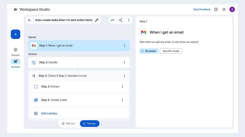 When you add a new flow by selecting a template in the Discover tab, you’ll be taken to the flow builder tool in the Workspace Studio app. You have to customize and test run it from here before you can activate it.